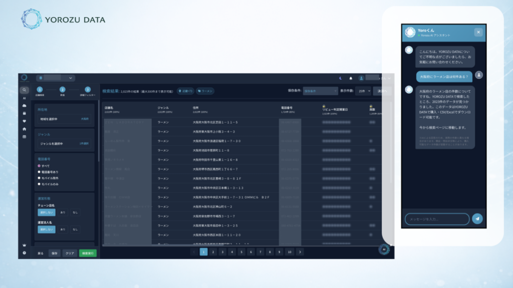 「Yoroくん」では、条件を組み合わせた検索に加え、データの傾向を把握するような問いにも対応しています。地域や業種、開業時期などを指定した検索はもちろん、「ラーメン店が多い都道府県」といったように、データの分布や特徴を知ることも可能です。